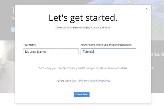 Una volta installato, dovrai ricaricare la pagina di Tour Builder. Fai click su “Crea un nuovo tour ” e si aprirà una finestra in cui dovrai inserire il nome del viaggio e l’autore.