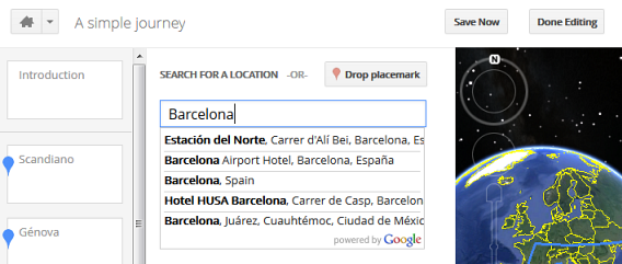 Le storie si compongono di tappe che vengono aggiunte con il pulsante blu nella colonna di sinistra. Devi iniziare con la ricerca di un luogo, digitando il nome o posizionando un marcatore. Quando sei sicuro che quello è il posto giusto, dovrai confermare.