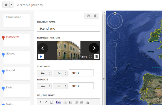 Oltre agli elementi multimediali, ogni tappa dell’itinerario dispone di un selettore di date (inizio e fine) e una casella di testo in cui puoi raccontare i fatti più importanti, ma senza dilungarti troppo.
